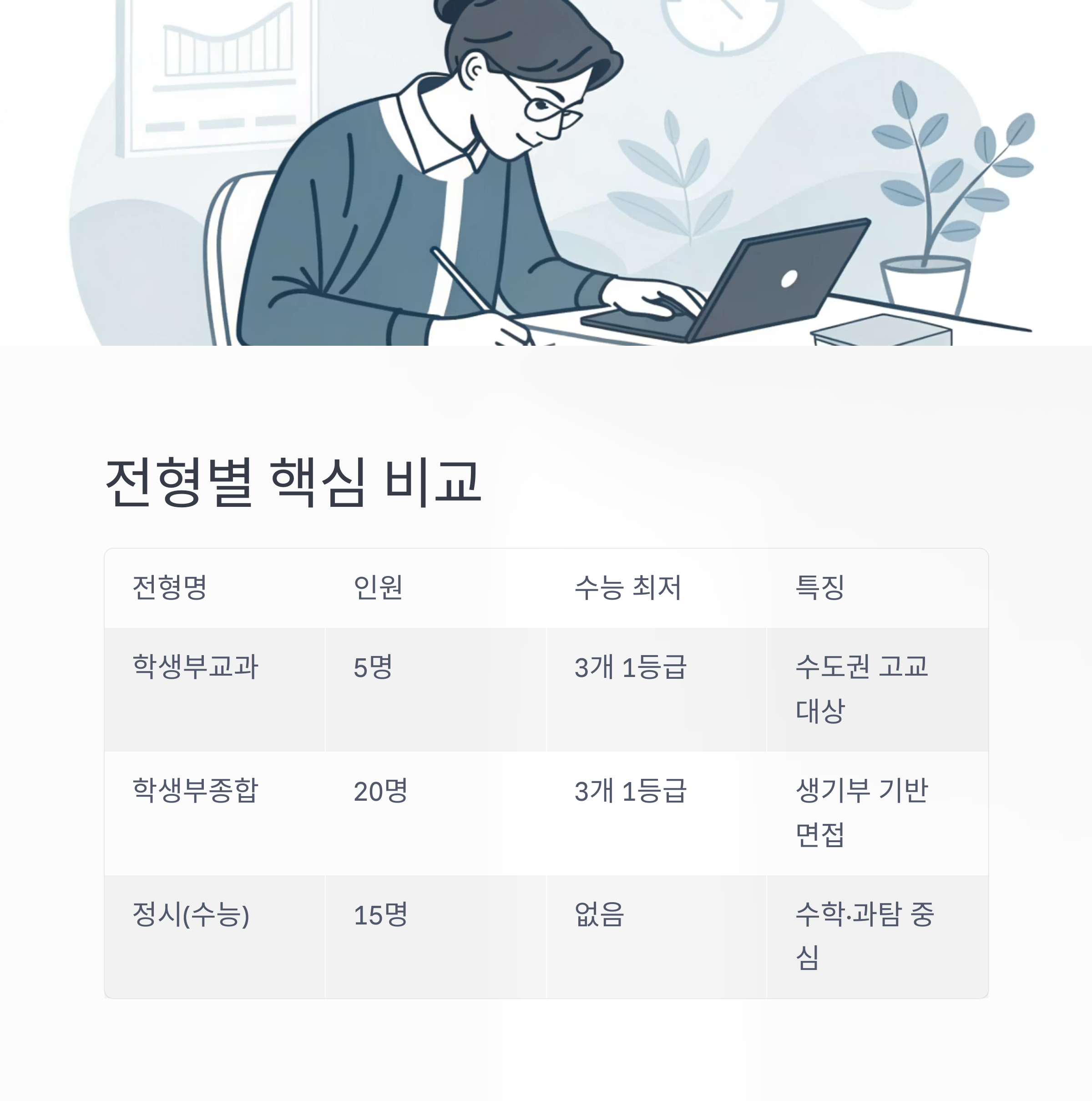 | 정시(수능) | 15명 내외 | 없음 | 수능 100% (수학 30%, 과탐 25%) | 수학 중심 고득점 전략 필요 |