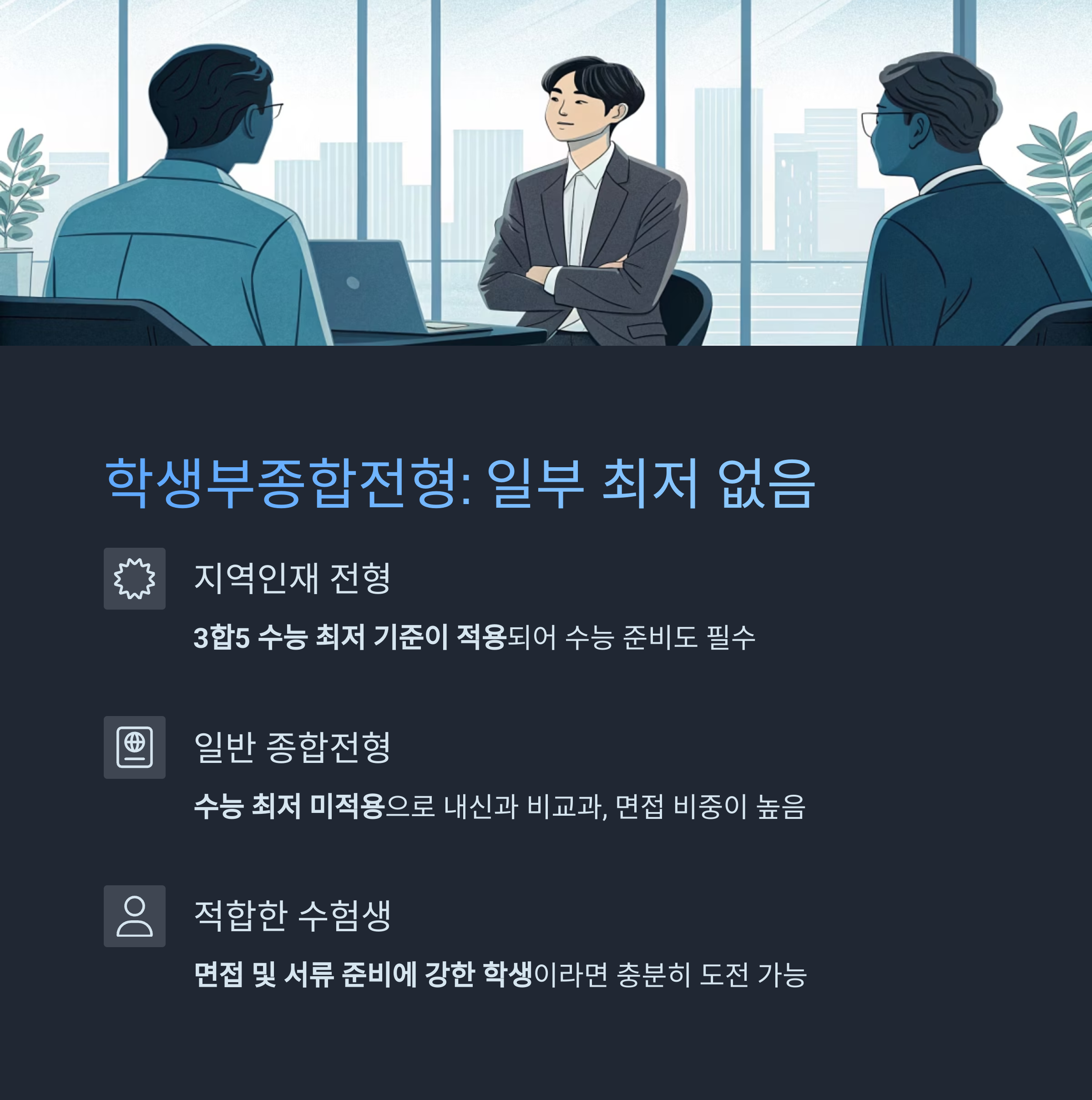| 수시 종합 | 일반/지역인재 | 없음 / 3합5 | 서류+면접 | 서류+면접 중심, 비교과 역량 중요 |
