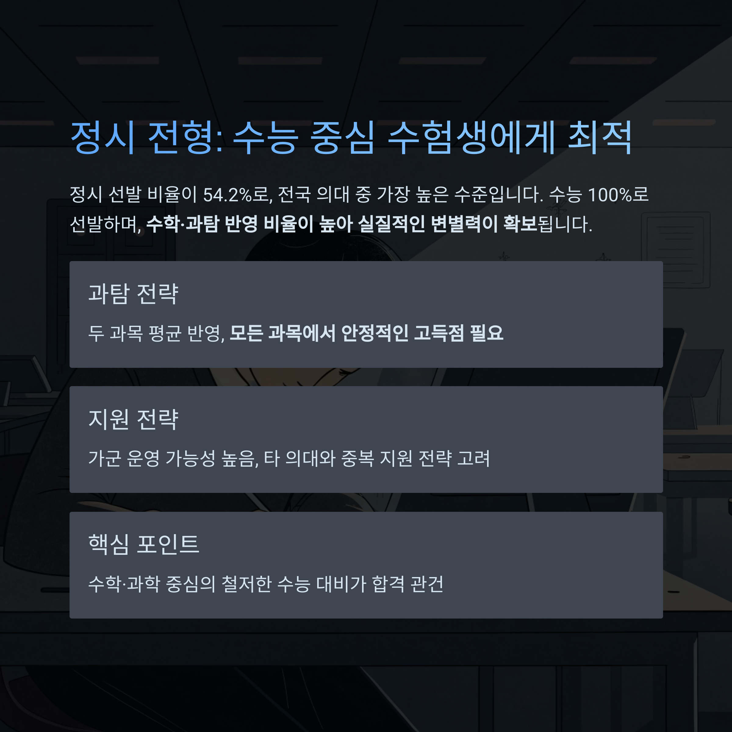 정시 선발 비율이 54.2%로, 전국 의대 중 가장 높은 수준입니다.