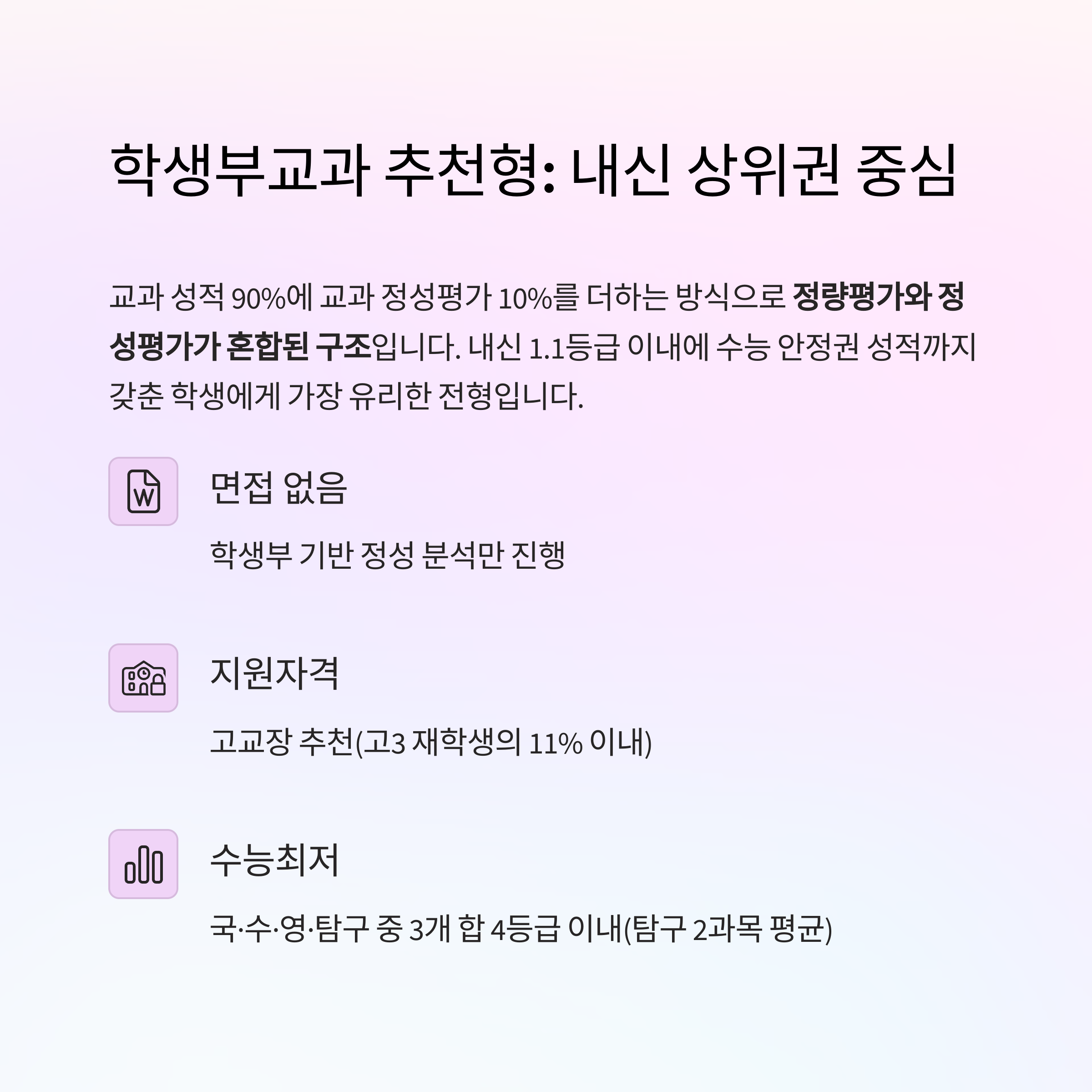 | 교과 추천형 | 내신 우수자 | 수능 최저 충족 + 고교장 추천 |