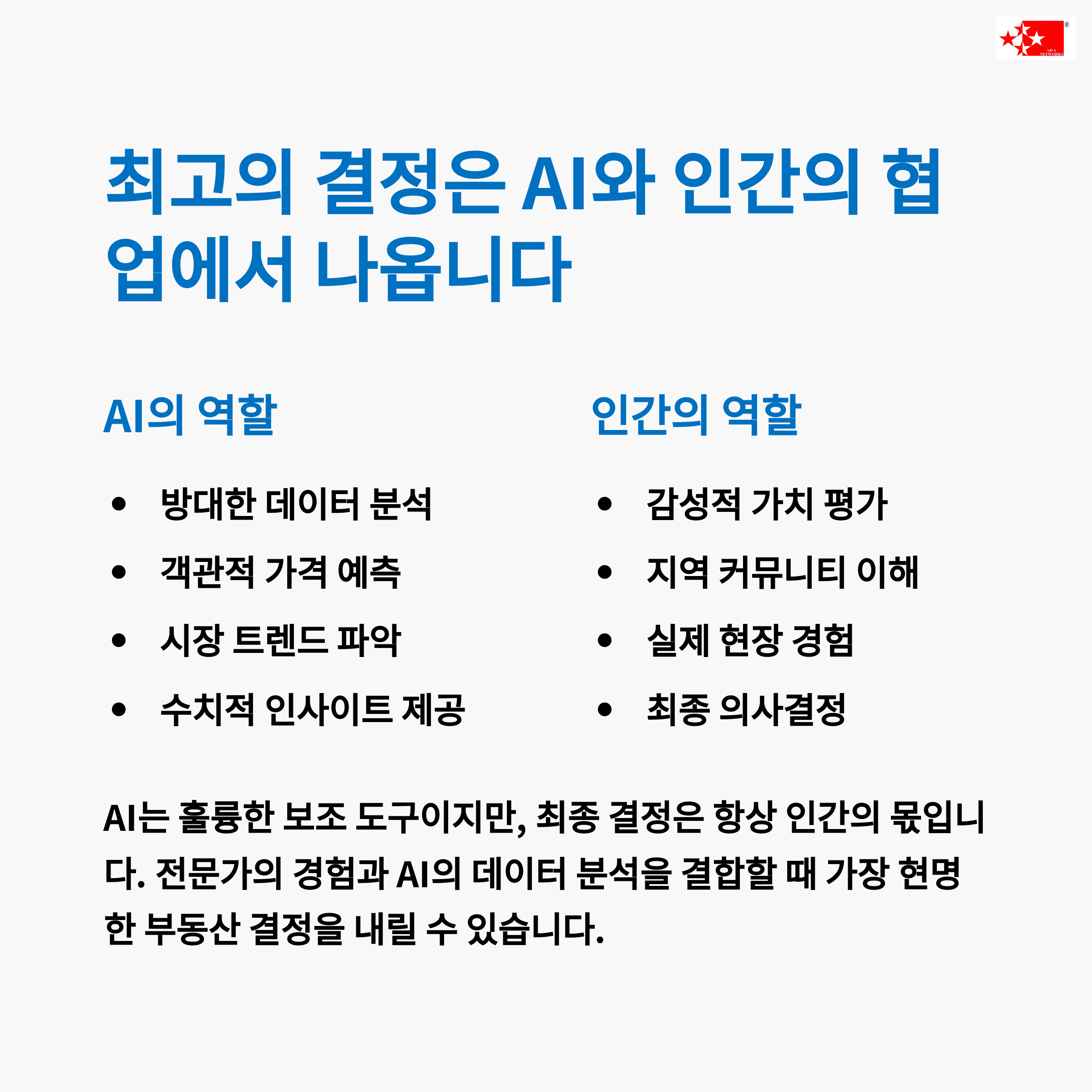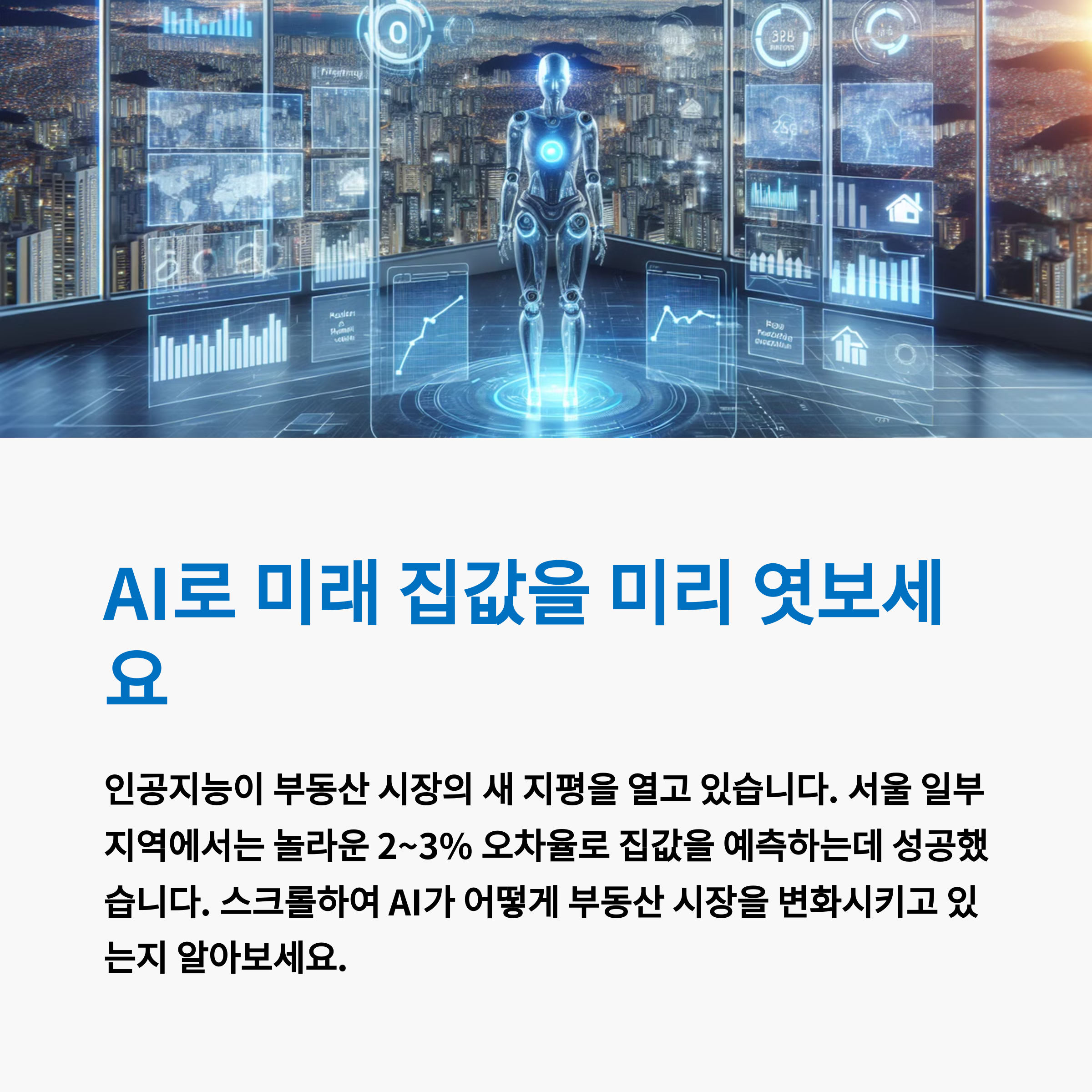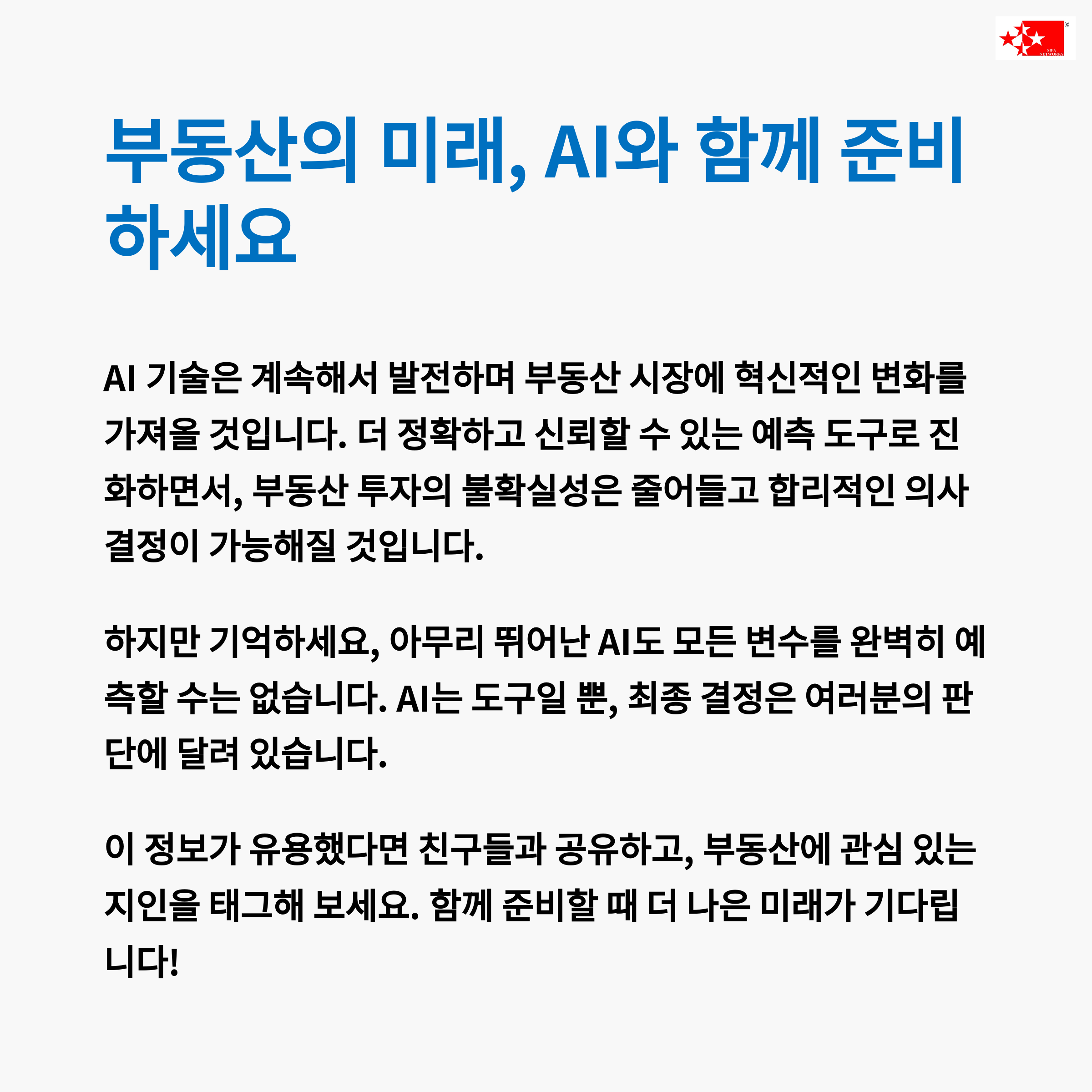우리가 내 집 마련을 고민하는 이유는 단순히 투자 때문만은 아니죠. 나와 가족의 삶의 질, 미래에 대한 안정감, 그리고 무언가를 성취했다는 작은 자부심까지... 그만큼 집값 예측은 민감한 문제일 수밖에 없어요. 하지만 이제는 혼자 고민하지 않아도 되는 시대입니다. AI가 우리의 부동산 판단을 도와줄 수 있으니까요. 물론 맹신은 금물이지만, 잘 활용한다면 똑똑한 선택에 큰 도움이 될 수 있어요. 여러분도 AI의 힘을 빌려 한 걸음 더 현명한 결정을 내려보세요!