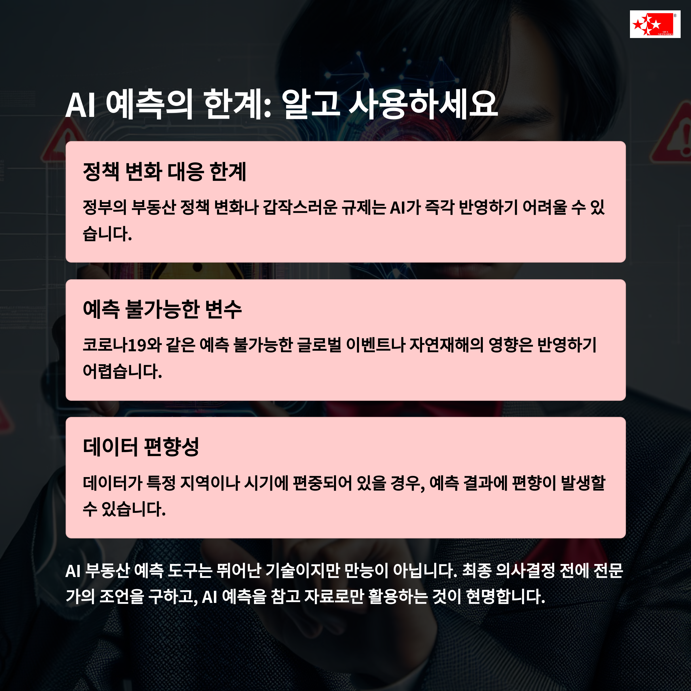그렇다고 AI가 전지전능한 건 아니에요. 특히 부동산처럼 수많은 심리적·정책적 요소가 복합적으로 작용하는 분야에서는 변수가 너무 많거든요. 예측에 앞서 아래의 한계점도 꼭 기억해야 해요.